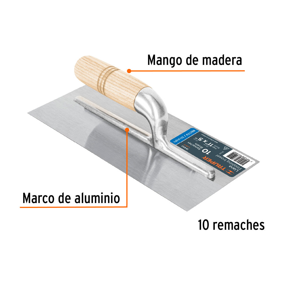 Es un producto de alta calidad y durabilidad para alisar y nivelar superficies de concreto, yeso o mortero. Esta llana tiene una hoja de acero templado de 11 pulgadas con canto recto, ideal para obtener acabados lisos y uniformes. Además, cuenta con 10 remaches que refuerzan la unión entre la hoja y el mango de madera, que brinda un agarre cómodo y ergonómico. Con esta llana podrás realizar trabajos de construcción o reparación con la garantía de Truper, una marca líder en herramientas.