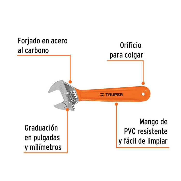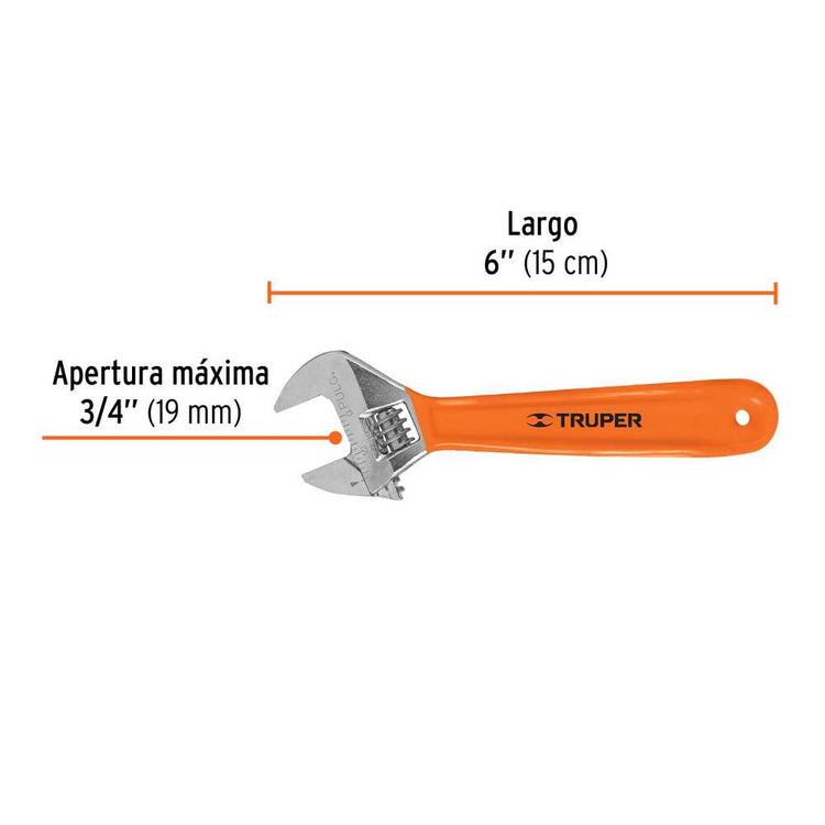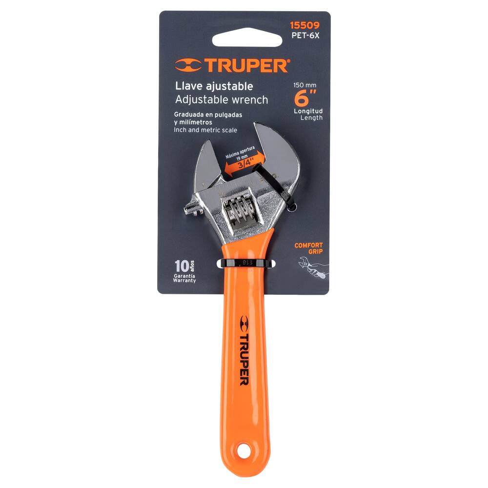 La Llave Crescent Truper con Grip de 6" es una herramienta versátil y cómoda que te permite ajustar tuercas y tornillos de diferentes tamaños con facilidad y precisión. Esta llave está forjada en acero al carbono, lo que le da una mayor resistencia al desgaste que las llaves comunes. Su acabado cromado la protege de la corrosión y le da un aspecto elegante. Su mango está cubierto de PVC resistente y fácil de limpiar, con un orificio para colgar. Además, tiene una graduación en pulgadas y milímetros en la apertura de la quijada, que te ayuda a identificar el tamaño de la pieza de trabajo.