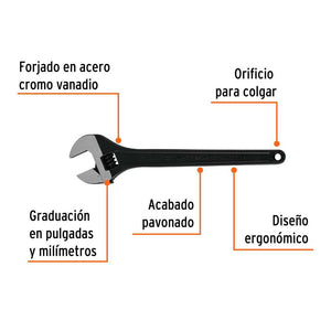 La llave Crescent Truper Expert Pavonada de 15" es una herramienta profesional que te permite ajustar tuercas y tornillos de diferentes tamaños con facilidad y precisión. Esta llave está forjada en acero al cromo vanadio, un material que le da una mayor resistencia al desgaste que las llaves comunes. Además, tiene un acabado pavonado que la protege de la corrosión y le da un aspecto elegante. Su escala marcada en milímetros y pulgadas en la apertura de la quijada te ayuda a identificar el tamaño de la pieza de trabajo. Su mango con diseño ergonómico y orificio para colgar te ofrece un mejor agarre y comodidad, y su muesca hexagonal te ofrece un mayor contacto con la tornillería, evitando el desgaste y el deslizamiento.