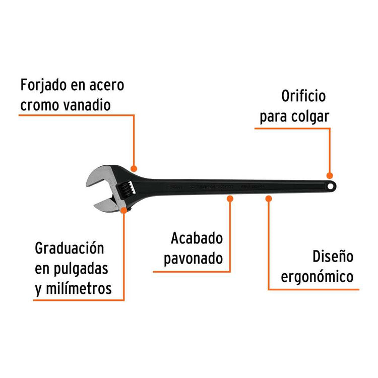 La llave Crescent Truper Expert Pavonada de 24 pulgadas es una herramienta de primera calidad diseñada para enfrentar los trabajos más exigentes con facilidad y confiabilidad. Con su tamaño generoso y su robusta construcción, esta llave ajustable es perfecta para una amplia variedad de aplicaciones industriales, de mantenimiento y de reparación.