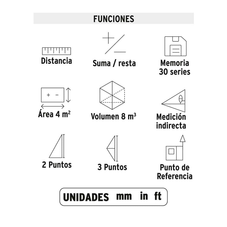 - Funciones de distancia, área (4 m²) y volumen (8 m³)