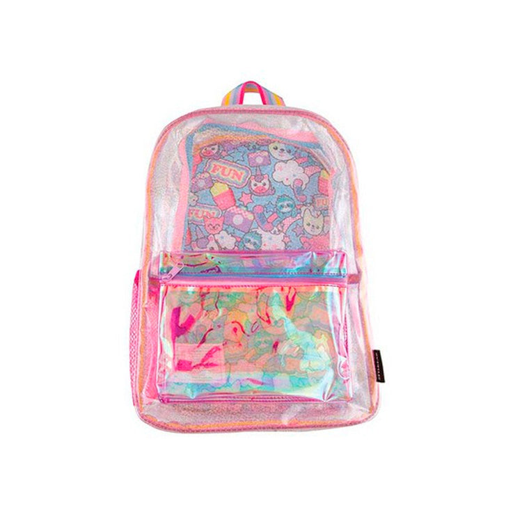 El material transparente brilla con purpurina incrustada. El panel frontal cuenta con un bolsillo con cremallera de color rosa neón para un fácil acceso y el panel lateral incluye un bolsillo para botella de agua. Y para hacerlo aún más especial, el panel interior trasero presenta una impresión ilustrada original de animales bebés Kawaii. Las correas son de nailon acolchado de color turquesa con detalles de arcoíris y un asa de transporte de arcoíris en la parte superior. Esté preparado para que le pregunten: ¿De dónde sacaste esa mochila?