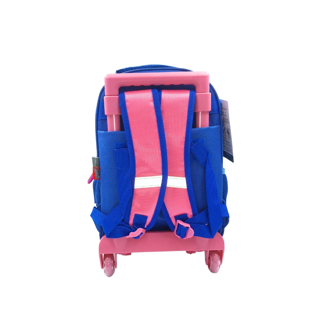 La mochila tiene un asa superior y dos tirantes acolchados y ajustables, que se pueden guardar en un bolsillo trasero con cremallera cuando no se usan. También tiene un sistema de trolley con dos ruedas y un asa telescópica, que facilita el transporte de la mochila.