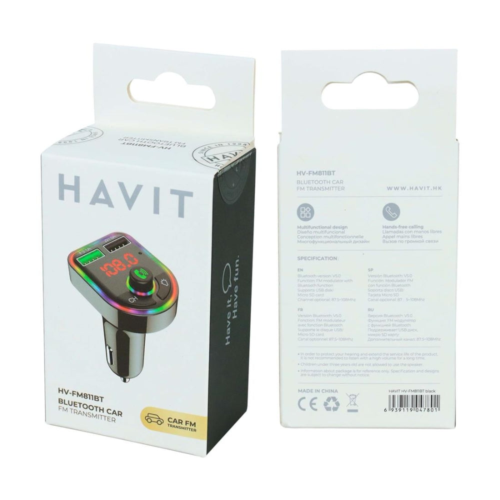 Modulador Havit Bluetooth v5.0+EDR MP3 Manos Libres Carga USB 3.1A Iluminacion RGB HV-FM811BT