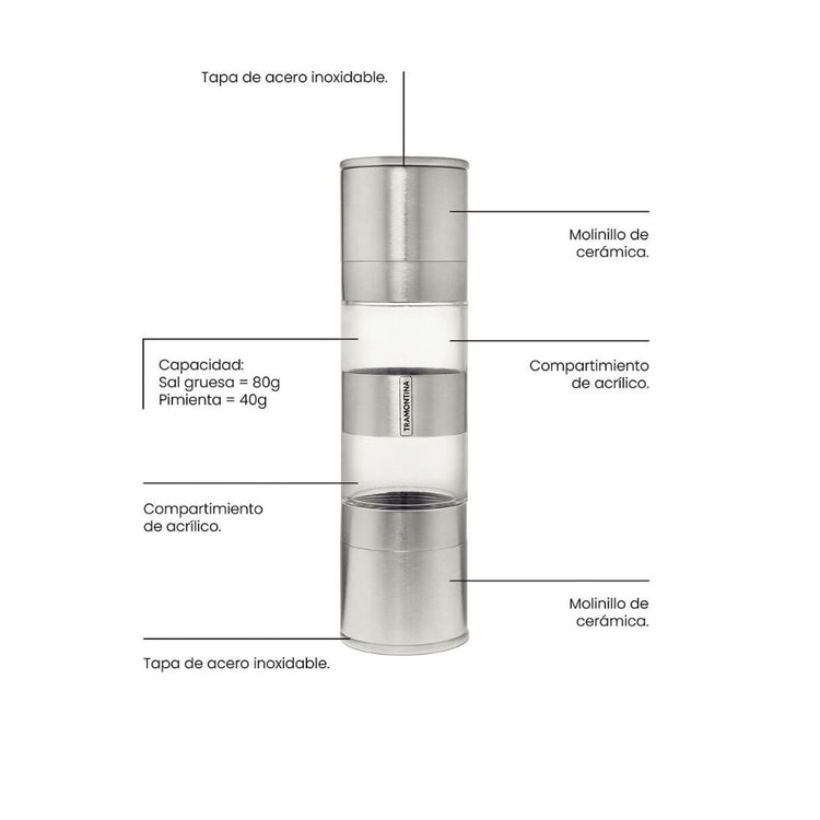 El molinillo de sal y pimienta Tramontina doble de acero inoxidable y acrílico con molino de cerámica de la línea Realce hará su día a día en la cocina más práctico y garantizará la belleza de su mesa. Cuenta con un diseño sofisticado, simple y elegante, ofreciendo engranajes de alta resistencia y durabilidad. Además, posee ajuste de molido con regulador de tamaño del grano, para que se ajuste a su gusto. ¡Una pieza que no puede faltar en su cocina!