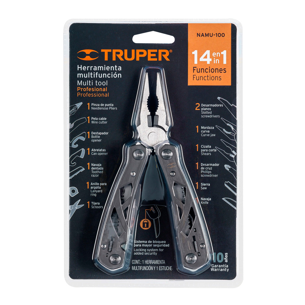 Está fabricada con acero inoxidable de alta calidad, lo que le otorga una gran resistencia y durabilidad. Su diseño es compacto y plegable, lo que te facilita su almacenamiento y transporte. Además, su color plateado le da un toque de elegancia y sofisticación, que te hará sentir orgulloso de tu herramienta. Truper con 14 Funciones es una herramienta imprescindible para cualquier persona que quiera estar preparada para cualquier eventualidad.