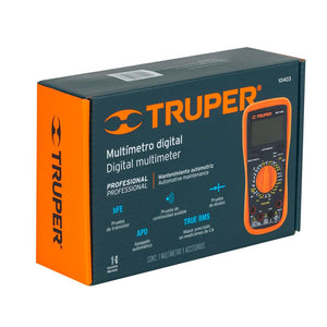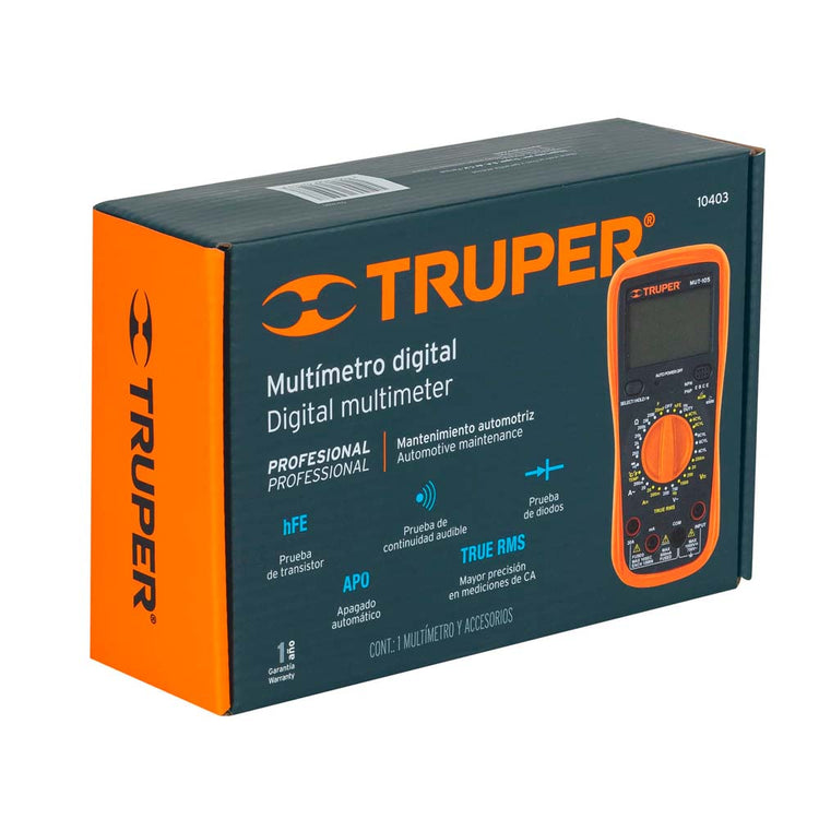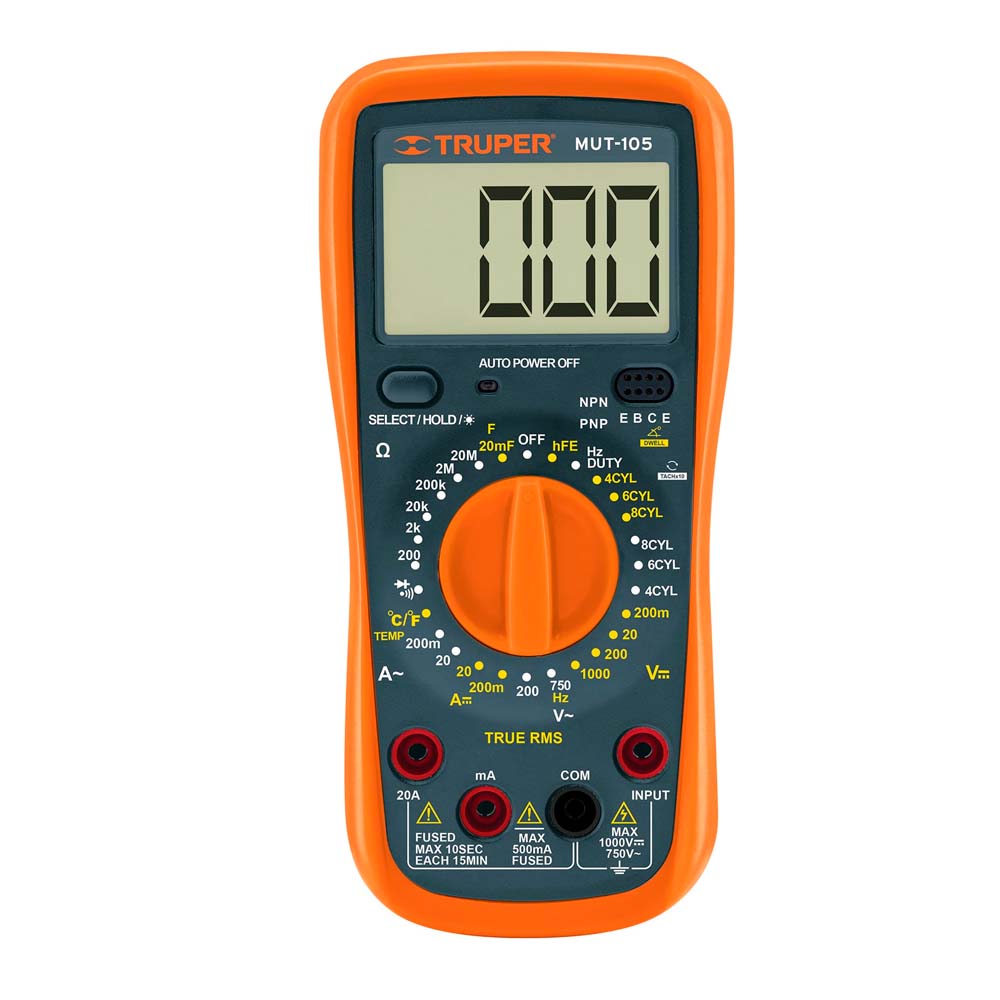 - Funciones: Prueba de continuidad audible, diodo, transistor NPN o PNP (0-1,000 B), Mayor precisión en mediciones de CA (True RMS) y Sistema de auto apagado (APO)