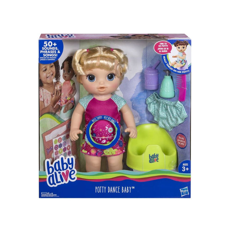 Los niños pueden compartir importantes momentos con su bebé jugando a que la ayudan a usar la bacinica. Cuando la muñeca tiene sed, llena el biberón con agua y dale de beber. Ahora tiene que ir al baño. Tómala de las manos y bailará. Ayúdala a sentarse en la bacinica y ella cantará e irá al baño. No te preocupes, el único lugar que moja es la bacinica. Recuerda jugar a que le lavas las manos y pon una etiqueta en su tabla de premios para mostrarle que lo hizo muy bien. Los pequeños adorarán vestir esta muñeca articulada con la ropa incluida, peinarla y escuchar todas las cosas graciosas que dice.
