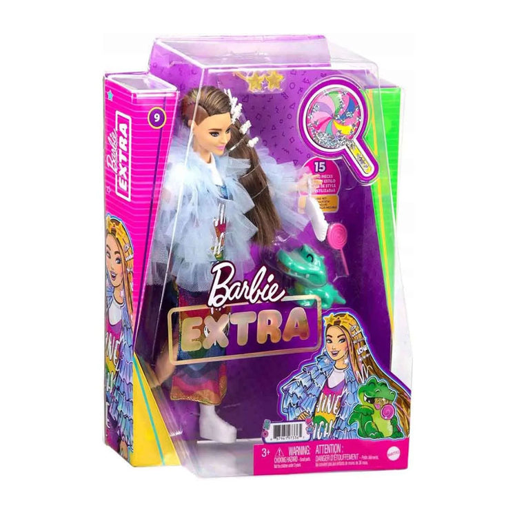 La muñeca Barbie es más curvilínea que el cuerpo original, y su peinado va grande con pelo largo castaño peinado liso con clips de pelo plateados. Vestido con patrón de arco iris, con mensaje gráfico "Shine Bright Like the Stars", en capas sobre una camisa blanca y debajo de un abrigo azul hecho de tul con volantes.