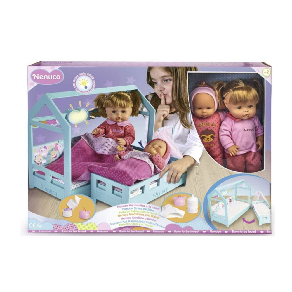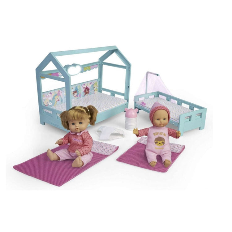 La cama grande tiene decoraciones coloridas, un cuento y una lamparita para dormir a las hermanitas, la cama pequeña tiene un dosel, la hermana mayor viene con un pañal y la hermana pequeña con un biberón.