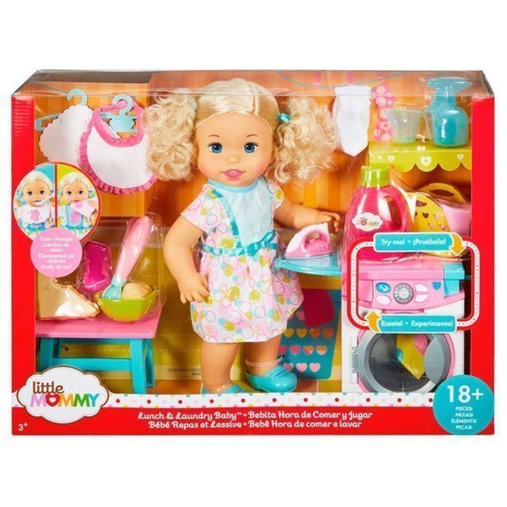 La muñeca Little Mommy Hora de comer y jugar, es un entretenido set interactivo para que las pequeñas mamás se diviertan aprendiendo cómo lavar y planchar su ropa y tomar un bocadillo para el almuerzo también.