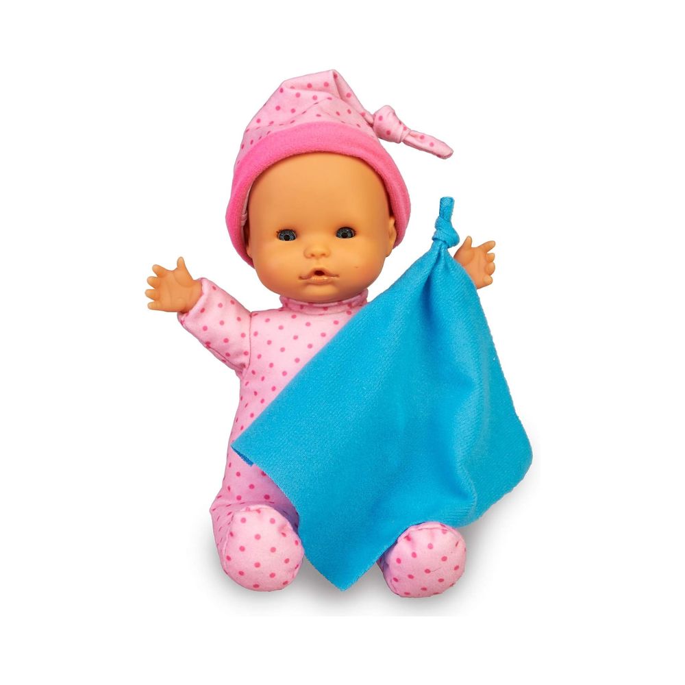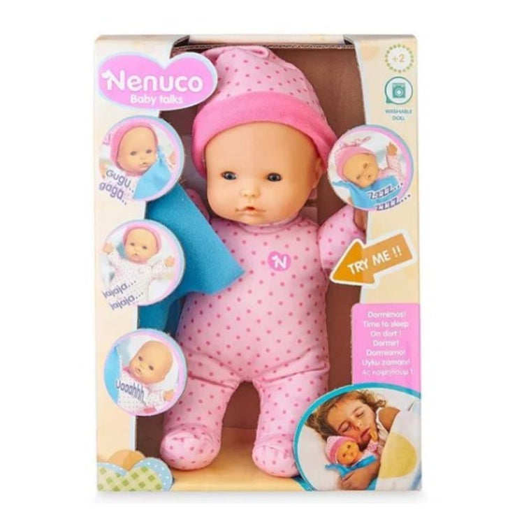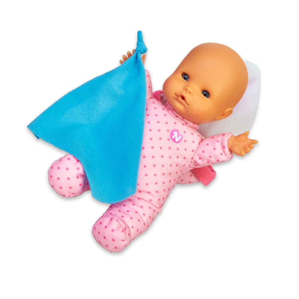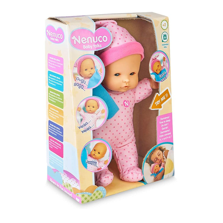 Este Nenuco le encanta dormir acompañado de su mantita, acuestalo para que cierre los ojos y haga sonidos de bebe, Cuando está despierta y le aprietas la barriguita, hace sonidos de bebé.