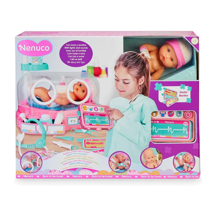 ¡Incluye un Nenuco recién nacido con nuevos accesorios y una incubadora con un Monitor New Born electrónico para cuidarlo!
