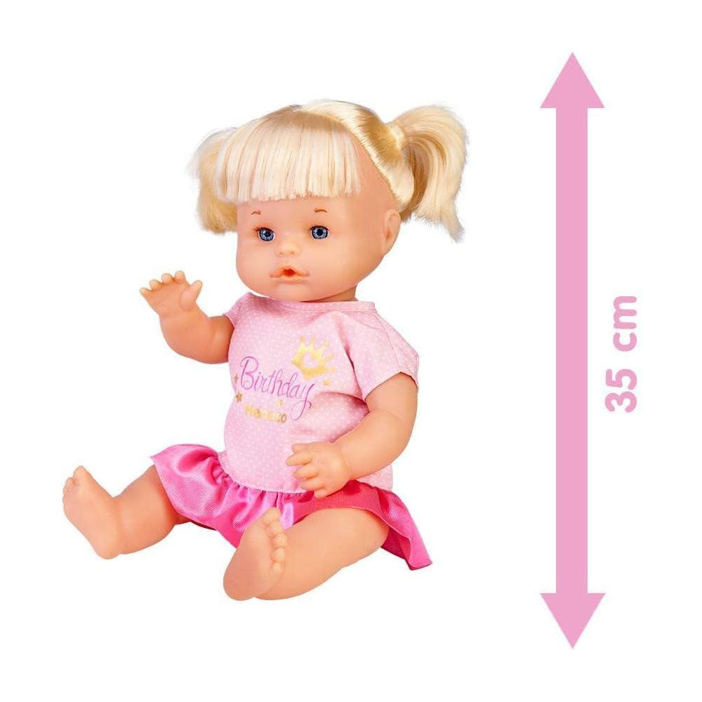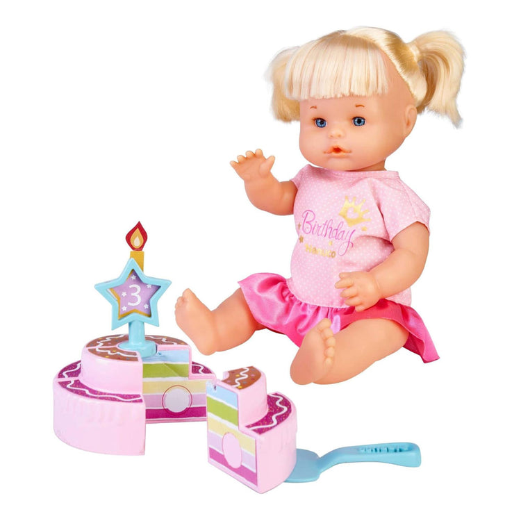 Está vestida para la fiesta con un bonito vestido, y ella también trae el pastel. Puedes personalizar la vela del pastel con el número de años que estás celebrando: uno, dos o tres. No olvides pedir un deseo antes de soplar la vela.