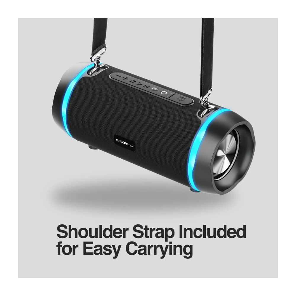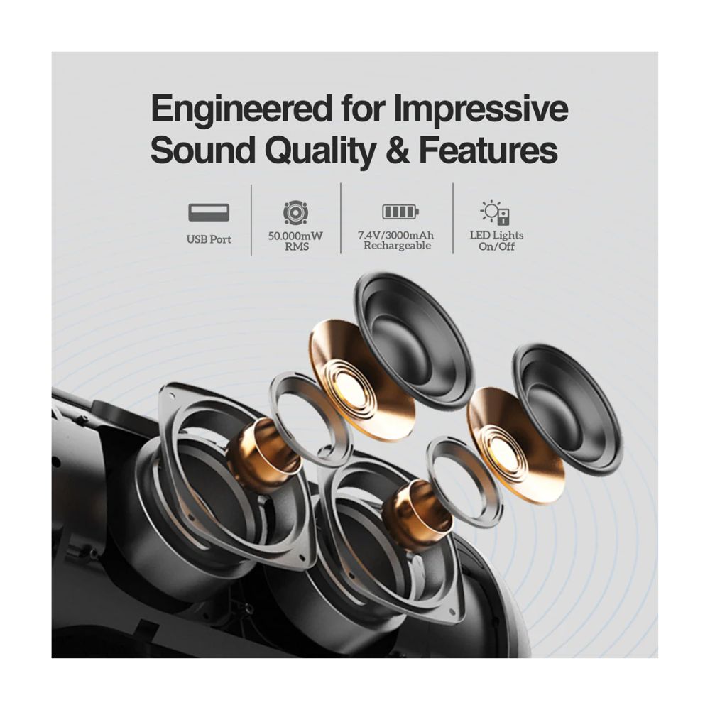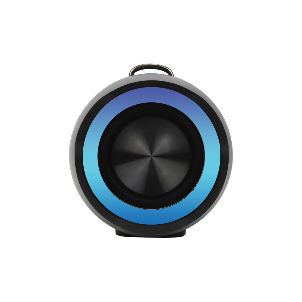 El Radyon X42 cuenta con una correa para el hombro e incluye impresionantes efectos de iluminación. Construido con los últimos chipsets y características . Esto permite un sonido excelente e integra tecnología TWS para poder emparejar dos parlantes para un sonido estéreo. Puede disfrutar de la música de forma inalámbrica a través de una conexión BT, la entrada auxiliar tradicional de 3,5 mm o a través de sus archivos de música almacenados en una unidad USB.