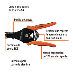 - Corta y pela cable calibre 16 AWG a 12 AWG (sólido y trenzado)