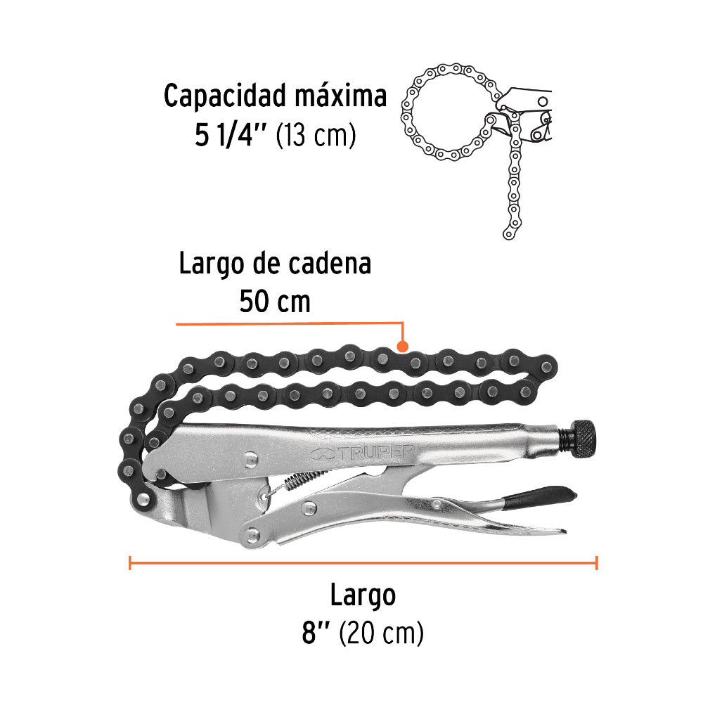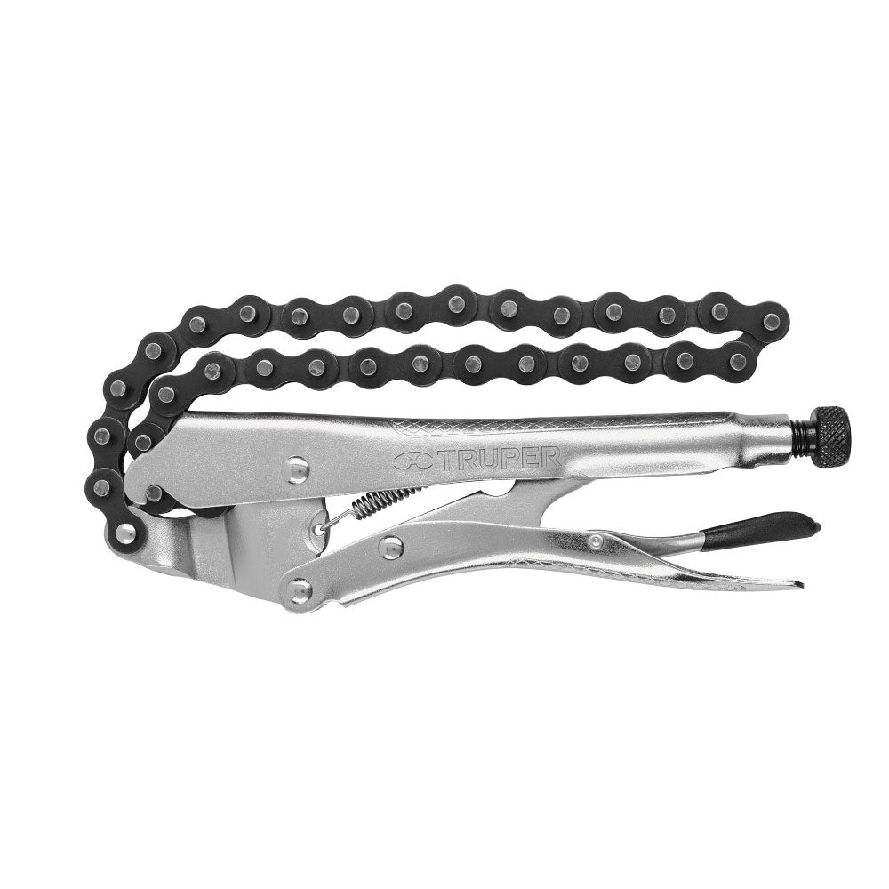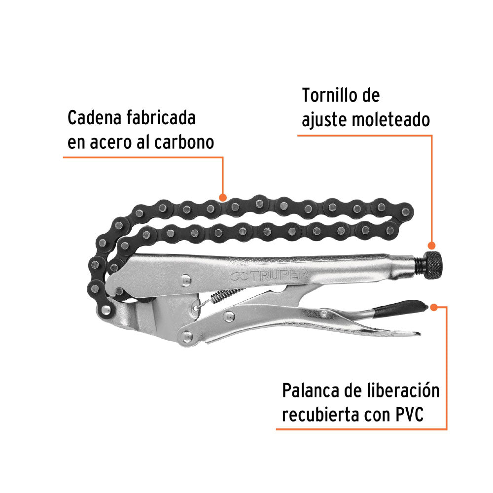 La cadena permite ajustar la apertura de la pinza para adaptarse a diferentes tamaños de objetos, mientras que las mordazas dentadas proporcionan un agarre sólido. Es útil en una variedad de aplicaciones, como trabajos de mecánica, plomería, carpintería y más.