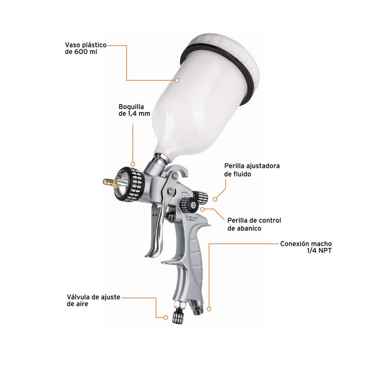 La Pistola de Aluminio Truper Expert de 1.4 mm con Vaso Plástico es una herramienta profesional para pintar superficies con acabados de alta calidad. Esta pistola cuenta con un cuerpo de aluminio resistente y ligero, un gatillo de doble acción que permite controlar el flujo de aire y pintura, y una boquilla de 1.4 mm que ofrece una excelente atomización y cobertura. Además, tiene un vaso plástico de 600 ml de capacidad, que se puede desmontar fácilmente para su limpieza y rellenado. La Pistola de Aluminio Truper Expert de 1.4 mm con Vaso Plástico es una herramienta que le brinda un rendimiento óptimo y una larga vida útil.