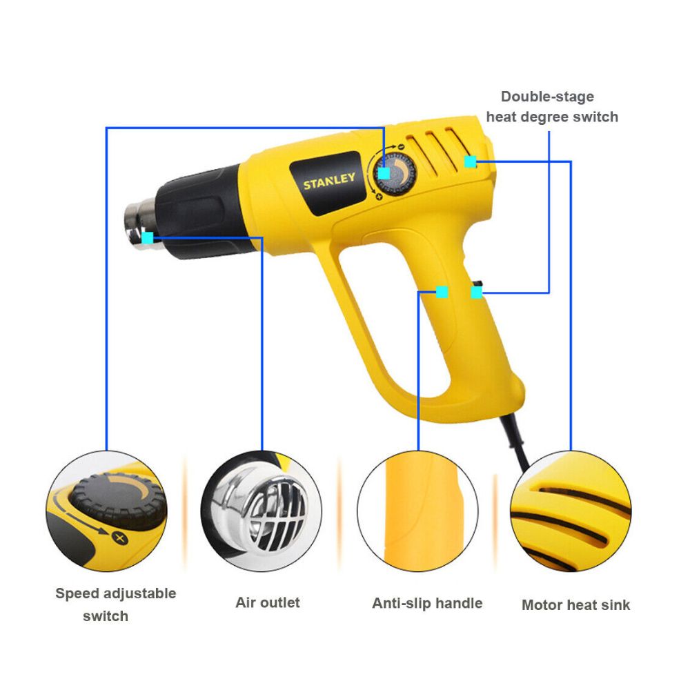 Pistola de calor Con interruptor de dos posiciones para un control de temperatura y flujo del aire. Tiene ajuste de calor variable, empuñadura cómoda y base recta para apoyar en superficies planas y trabajar con mayor comodidad y con manos libres.