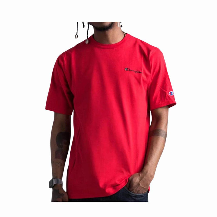 Polera Champion con logo pequeño bordado en la parte superior delantera, lado izquierdo del pecho.