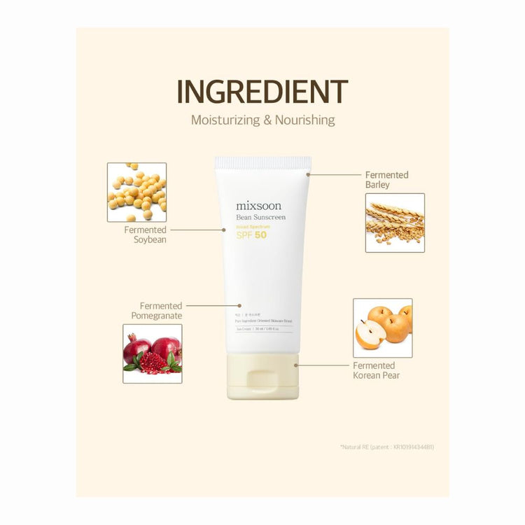 El protector solar Bean de Mixsoon es un protector solar químico que ofrece protección FPS 50 de amplio espectro contra los dañinos rayos UVA y UVB, sin dejar marcas blancas. Registrado como protector solar a prueba de agua de venta libre, es perfecto tanto para uso diario como para actividades al aire libre. Su fórmula, que cuida la piel, presenta una textura cremosa y suave que se funde con la piel, ofreciendo un acabado fresco e hidratado. Enriquecido con ingredientes fermentados, como soja, cebada, granada y pera coreana, junto con extracto de brote de trigo, nutre y protege. Su textura sin perfume y no grasa se absorbe fácilmente, sin dejar marcas blancas, lo que lo hace ideal para todo tipo de piel, incluso la sensible. Suave, sin perfume y apto para todo tipo de piel, este protector solar es tu opción ideal para una luminosidad y protección diarias.
