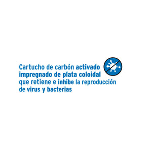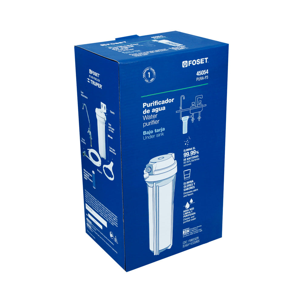 Purificador de agua bajo tarja Foset tiene un vaso y manguera de polipropileno, conectores de POM y cuello de acero inoxidable, cartucho de carbón activado, impregnado de plata coloidal que elimina el 99.9% de bacterias, elimina el sabor a cloro del agua y retención de sólidos en suspensión.