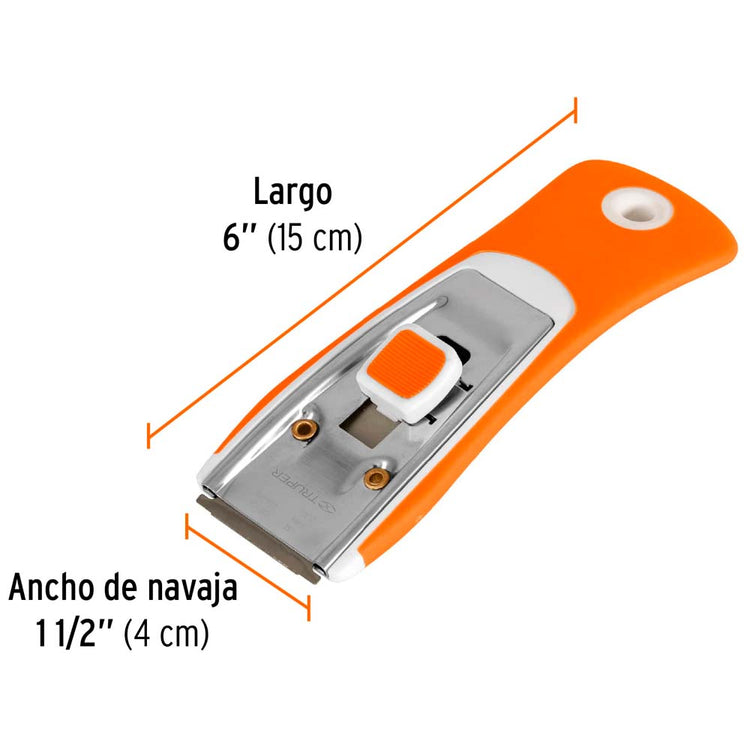 Este raspador con navaja de Truper, es la herramienta perfecta para todos tus proyectos de bricolaje. Su mango ergonómico te ofrece un agarre cómodo y seguro, mientras que su navaja de acero de alta calidad te permite realizar cortes precisos y limpios. Elimina pegamento, pintura, silicón y cemento de superficies lisas como vidrio, azulejo, paredes y metal