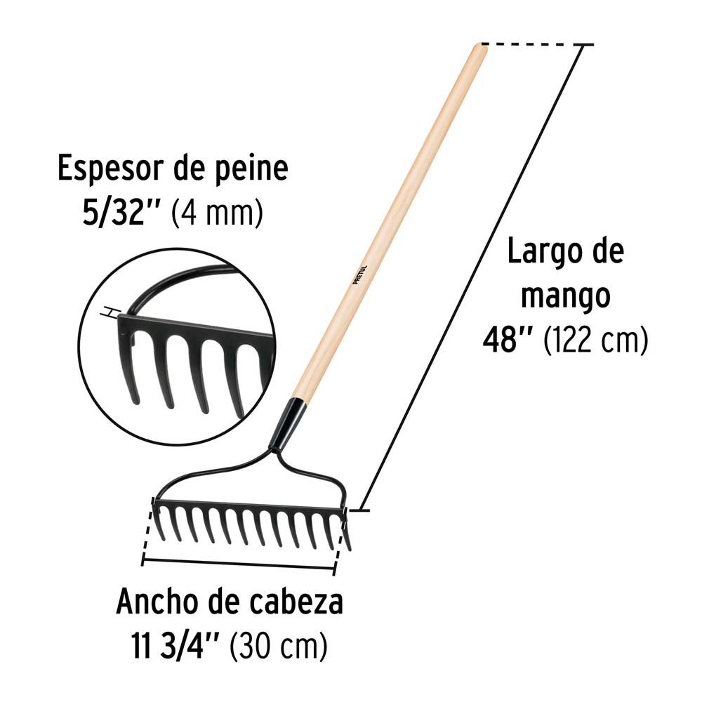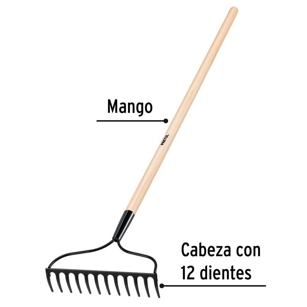 Se emplea para aflojar el suelo, nivelar, recoger las hojas secas y restos de césped.