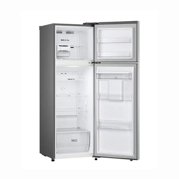 El refrigerador LG modelo VT29WPPDC es un electrodoméstico tipo Top Freezer con una capacidad total de 254 litros, ideal para hogares que buscan eficiencia energética y un diseño moderno en color acero inoxidable (inox). Está equipado con un compresor Smart Inverter que garantiza un funcionamiento silencioso y duradero, respaldado por una garantía de 10 años. Incorpora tecnología DoorCooling+™ para un enfriamiento uniforme y más rápido, además del sistema No Frost que elimina la necesidad de descongelar manualmente. Entre sus funciones adicionales se destacan el dispensador de agua externo, la bandeja de hielo móvil y el control de humedad Moist Balance Crisper™ que ayuda a conservar mejor frutas y verduras. También cuenta con la función Smart Diagnosis™ para facilitar el mantenimiento a través de una app móvil. Sus dimensiones son 555 x 1.667 x 630 mm y tiene una clasificación energética A+, con un ba