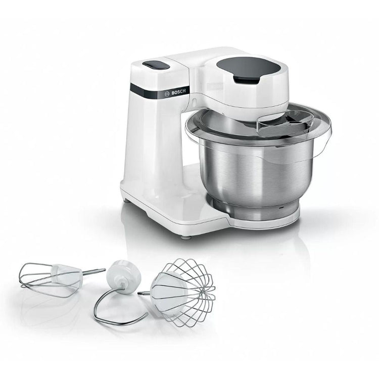 El robot de cocina Bosch MUMS2EW00 incluye una gran variedad de accesorios para que puedas realizar una amplia gama de tareas culinarias: Batidor plano: ideal para mezclar masas suaves, cremas y salsas. Gancho para amasar: perfecto para preparar masas de pan, pizza y bollería. Varillas batidoras: para montar claras a punto de nieve, nata y cremas. Espátula de mezcla: para remover y raspar los ingredientes del bol. Tapa protectora contra salpicaduras: mantiene tu cocina limpia mientras mezclas los ingredientes. Además, el robot de cocina Bosch MUMS2EW00 cuenta con 4 velocidades ajustables para que puedas adaptar la potencia a cada tarea. Su diseño compacto y elegante lo convierte en un electrodoméstico que encaja a la perfección en cualquier cocina. Con el robot de cocina Bosch MUMS2EW00, cocinar será más fácil, rápido y divertido que nunca.