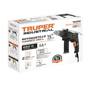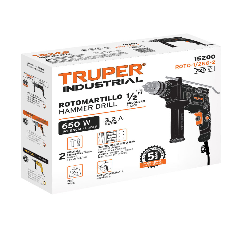 Con giro de 360° para mayor comodidad y mayor control en el perforado, ya que contiene un selectro de función taladro o rotomartillo, con un mango ergonomico y mango auxiliar ideal para perforación en concret, madera y metal.