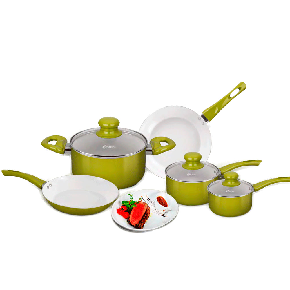 Renueva tu cocina con el Set de Ollas Oster OS-19110, un conjunto de 8 piezas con recubrimiento cerámico antiadherente, libre de PTFE y PFOA. Su diseño moderno en color verde le da un toque fresco y elegante a tu cocina, mientras que su excelente distribución del calor garantiza una cocción más uniforme y saludable.