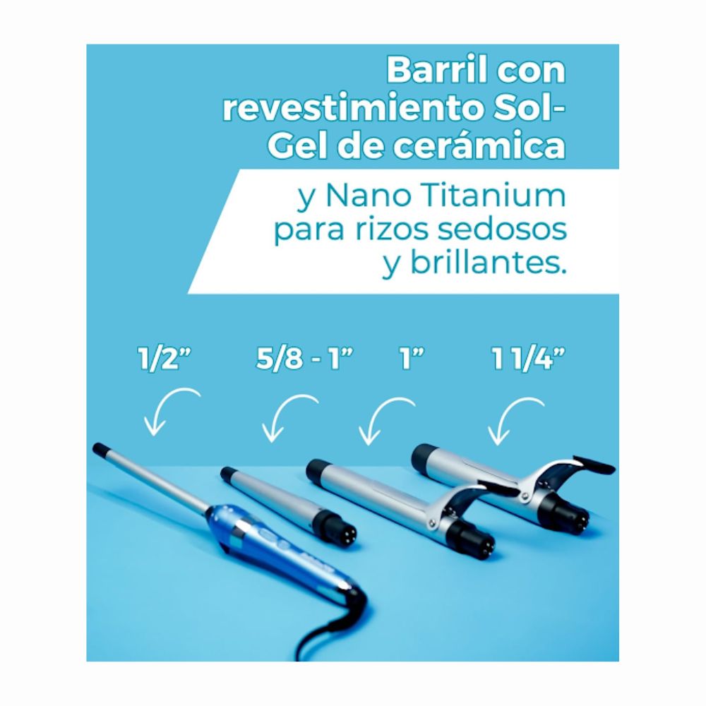 - Barril con revestimiento Sol-Gel de cerámica y Nano Titanium, ideal para rizos más sedosos y brillantes.