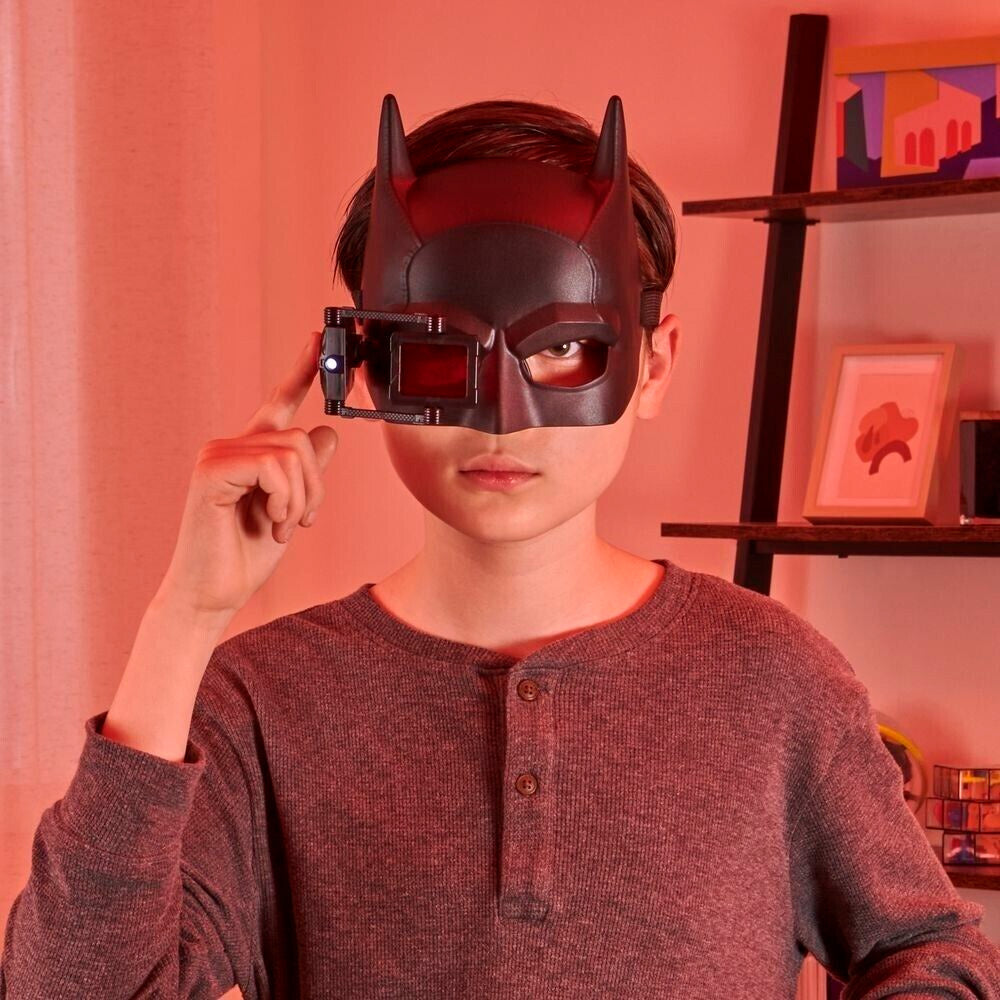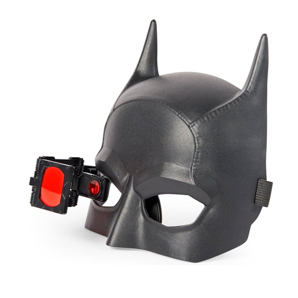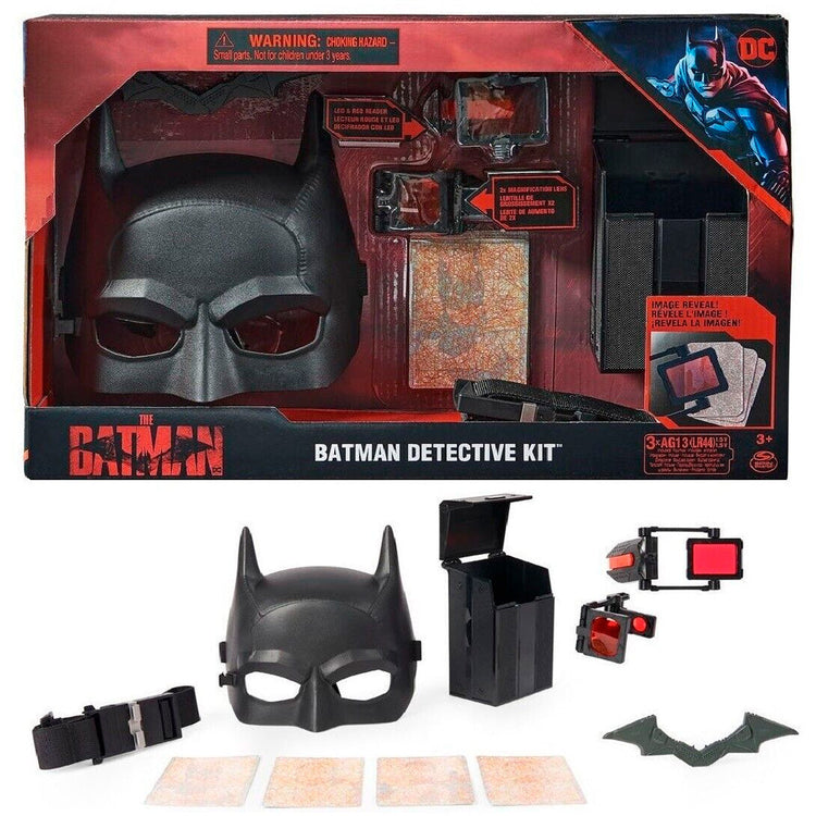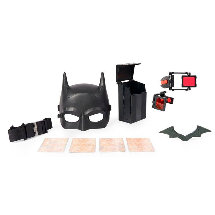 - Incluye: 1 máscara de Batman, 1 cinturón multiusos, 1 estuche de detective, 1 Batarang, 1 lente de revelación roja con luz LED, 1 lente de aumento, 4 tarjetas de pruebas, 1 guía de instrucciones