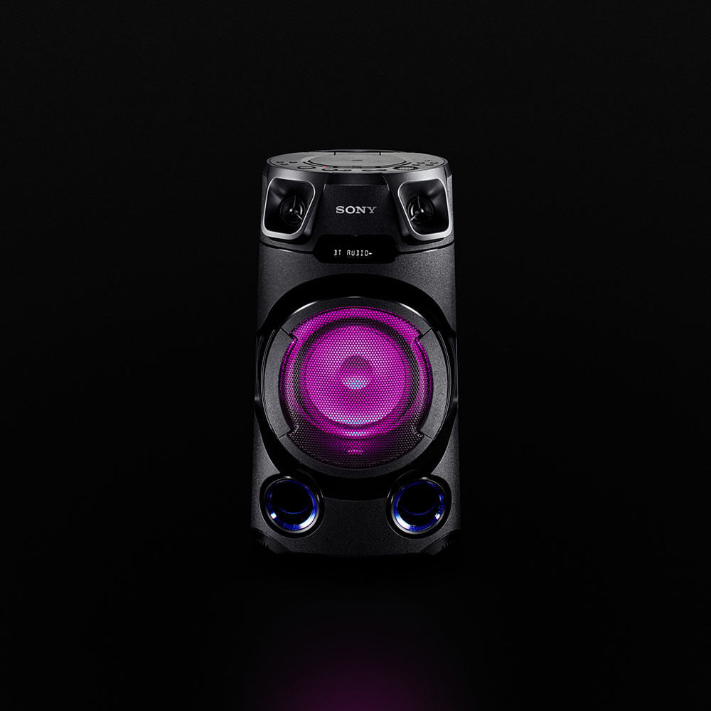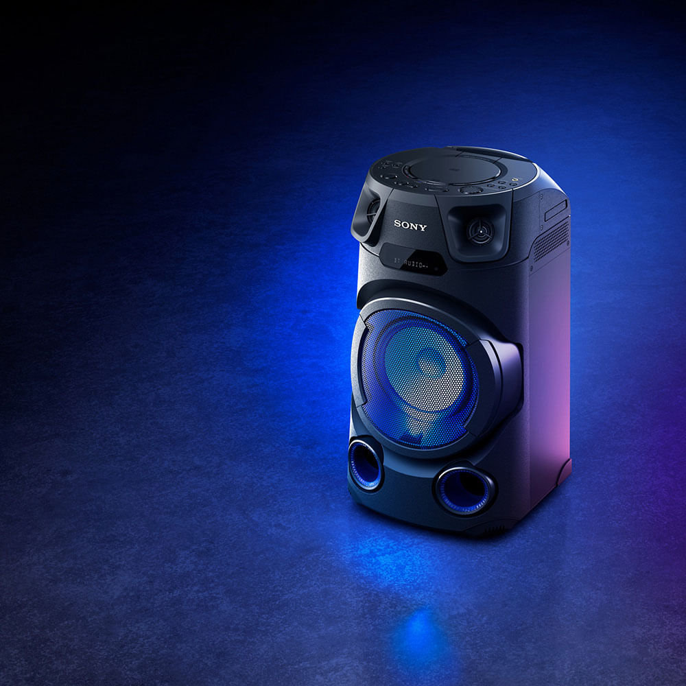 El compacto MHC-V13 ofrece un sonido impresionante. Dos tweeters de alta eficiencia y JET BASS BOOSTER distribuyen el sonido por la fiesta, para que tu música llegue más lejos desde el frontal de la unidad y tus invitados disfruten de un sonido claro.