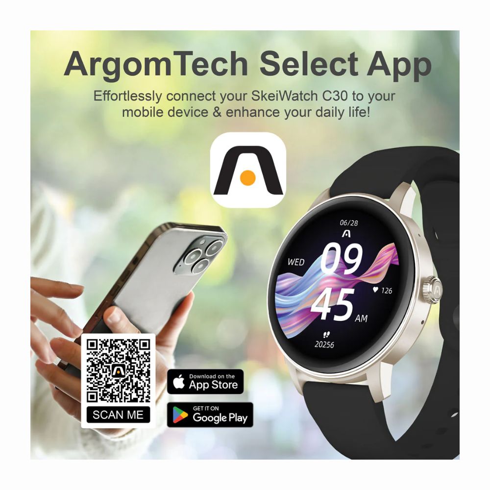 Alcanzar tus objetivos de salud a menudo puede resultar difícil y abrumador. Por suerte, con los relojes Skei de ArgomTech, lograr tus objetivos es fácil y placentero. El smartwatch C30 está equipado con funciones excepcionales, como sensor de frecuencia cardíaca, monitorización de la presión arterial, monitorización del sueño, monitorización del estrés, niveles de oxígeno, podómetro y monitor de actividad física. También ofrece funciones esenciales como la función SOS para mayor seguridad, actualizaciones de stock para mantenerte informado y un reloj mundial para el seguimiento de la hora global.