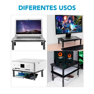 - Elevación Ergonómica: Eleva tus monitores a una altura óptima para reducir la fatiga visual y mejorar tu postura, lo que resulta en una experiencia de trabajo más cómoda y saludable.