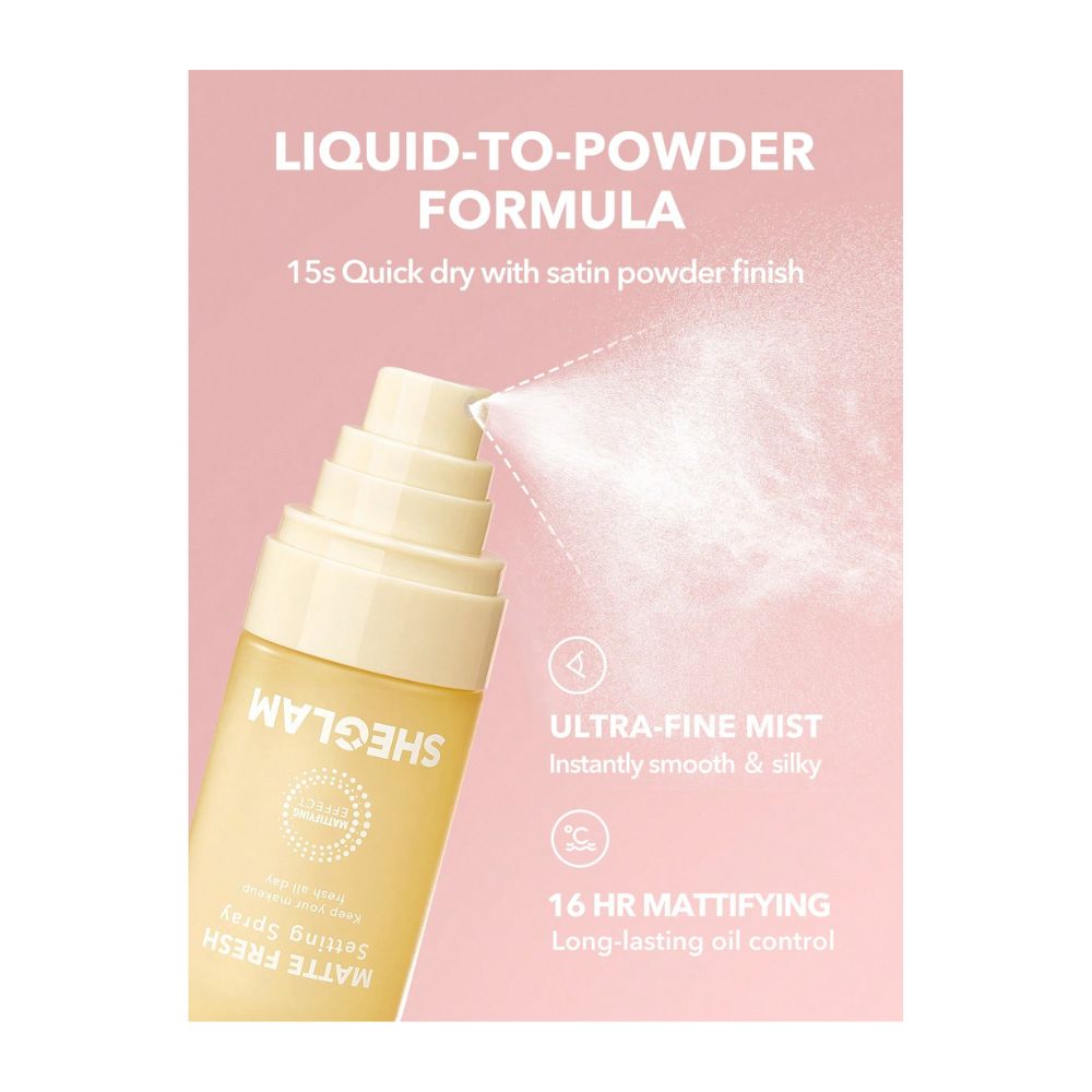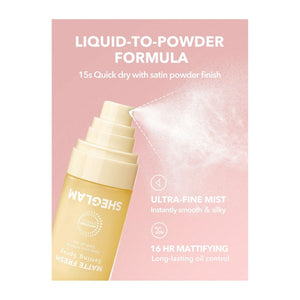 El Sheglam Matte Fresh Setting Spray es un fijador de maquillaje de larga duración que proporciona un efecto matificante, controlando y combatiendo el brillo a lo largo del día. Su fórmula ligera y de secado rápido suaviza instantáneamente la piel, dejándola con un acabado suave y luminoso, similar al de la seda.