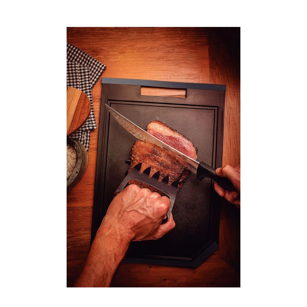 La tabla de corte Tramontina Churrasco Black en polipropileno negro es muy importante para servir asados exitosos. Fabricada en polipropileno negro, puede emplearse de ambos lados con texturas diferentes: la textura lisa, más adecuada para alimentos crudos, y la textura rugosa, ideal para cortar alimentos cocidos o asados. Además, la tabla posee bordes con revestimiento de goma, que no permiten que se deslice, y protección antimicrobiana, que inhibe la proliferación de hongos y bacterias en su superficie. Soporta temperaturas de hasta 90 grados y es apta para lavavajillas. Esto llevará mucha practicidad a su rutina diaria. ¡Su asado quedará aún mejor con Tramontina!