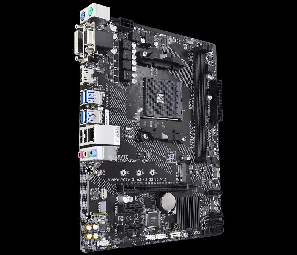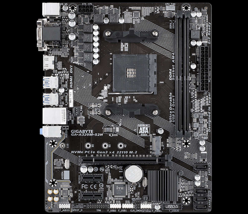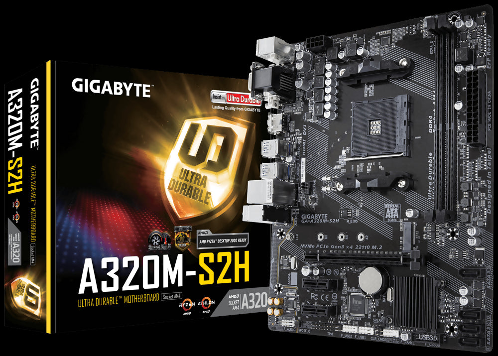 Tarjeta Madre GIGABYTE GA-A320M-S2H 2xDDR4 PCI-E USB3 Socket AM4 Almacenamiento a bordo rápido con NVMe PCIe Gen3 x4 110 mm M.2 (hasta 32 Gb / s) La solución GIGABYTE M.2 ofrece un rendimiento de almacenamiento y soporte considerablemente más rápidos para las interfaces PCIe y SATA * para dispositivos M.2 SSD.