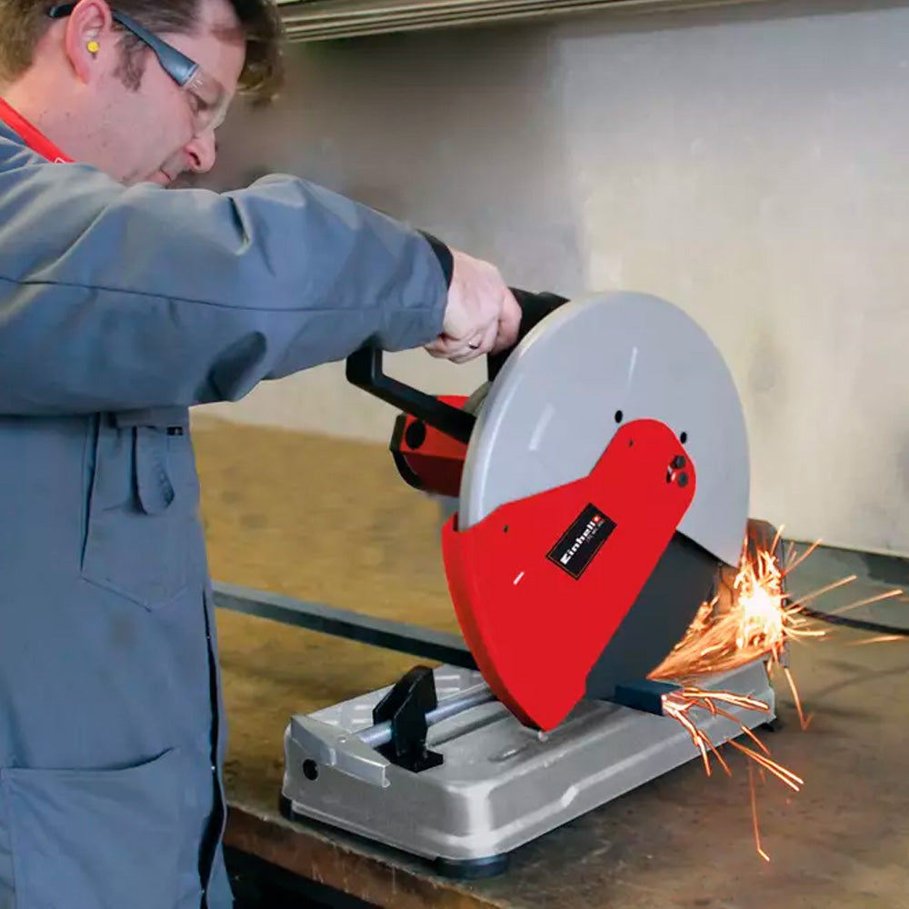 Cortar a la medida y cortar metal en varios espesores. Para tubos, barras planas, barras redondas y barras perfiladas de hierro, aluminio y metales no ferrosos: con una potencia de 2300 W y una velocidad de 4000 rpm, la tronzadora es ideal para usar en el taller o el garaje de la afición . Tiene una función de funcionamiento suave para proteger el sistema mecánico contra un par elevado. El tope de altura ajustable permite que la altura de corte se ajuste con precisión.