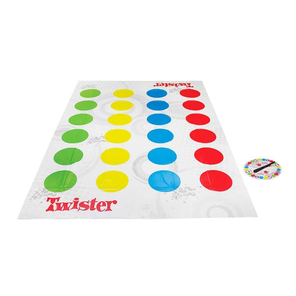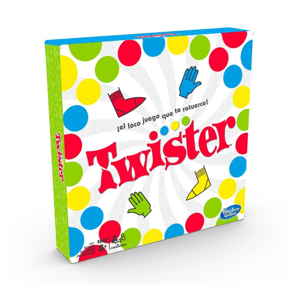 Es el juego que te retuerce de risa ¡con un nuevo giro! Este juego Twister se juega como el clásico juego Twister, y cuenta con 2 movimientos adicionales: El que gira, decide y al aire.