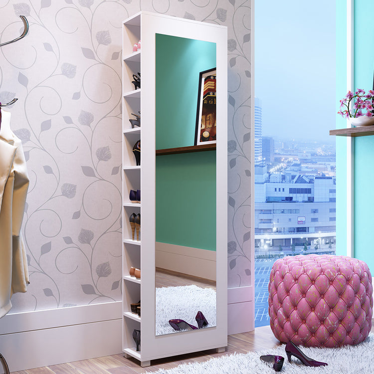 Zapatero de Meláminico, con capacidad de 18 pares de zapatos, delante tiene un espejo de gran tamaño, un diseño exclusivo y elegante, practicidad y belleza a la hora de organizar tus calzados.